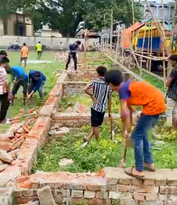 ফেসবুক লাইভের ভিডিওতে দেখা গেছে, ২৪ আগস্ট সকালে একদল যুবক ইটের গাঁথুনি ভাঙ্গছে। এসময় মাঠের পাশে বসে থাকতে দেখা যায় উপজেলা ছাত্রলীগের সভাপতি আতিয়ার রহমান বাঁধনকে। ভাঙ্গার সময় তাদের বলতে শোনা যায়- সব প্রক্রিয়া শেষ করে তারা মাঠ রক্ষার কাজ করছেন। তাদের বাঁধা দেওয়ার কেউ নেই। এছাড়া স্থানীয় শিপনের নেতৃত্বে শুরুর প্রায় তিনঘন্টার মধ্যে নির্মাণাধীন ওই মার্কেটের ওয়াল ভেঙ্গে ফেলে।