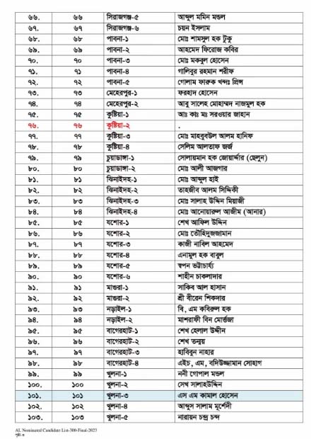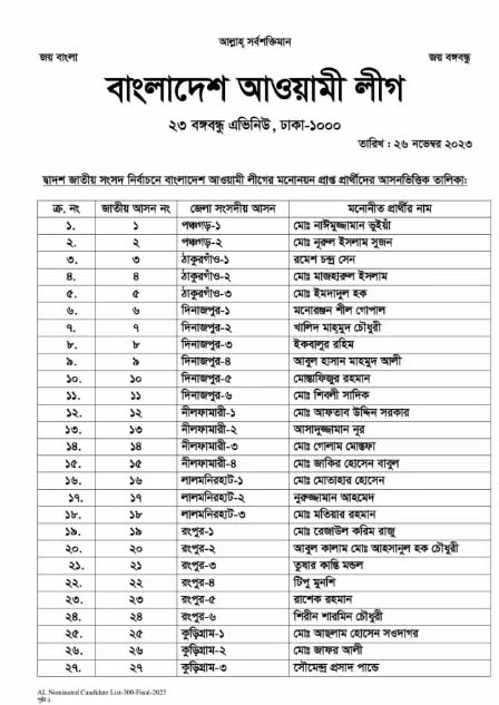দ্বাদশ জাতীয় সংসদ নির্বাচনে অংশ নিতে আওয়ামী লীগের দলীয় প্রার্থী ঘোষণা করা হয়েছে। দলটির সাধারণ সম্পাদক ওবায়দুল কাদের আজ রবিবার বিকাল চারটার দিকে নৌকা পাওয়া প্রার্থীদের নাম ঘোষণা করেন।