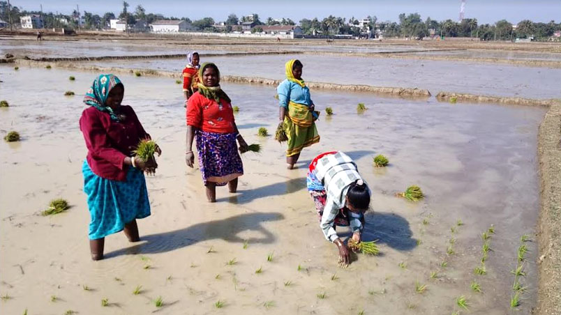 তারা সবাই পার্শ্ববর্তী বিরামপুর উপজেলার খানপুর ইউনিয়নের বুচকি আদিবাসীপাড়ার বাসিন্দা। কৃষক তমালের ৬ বিঘা জমিতে বোরো চারা রোপণের চুক্তি নিয়েছেন তারা। তাদের ১১ জন ক্ষুদ্র নৃ-গোষ্ঠীর নারী শ্রমিকের একটি দল রয়েছে।