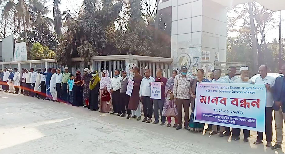 বৃহস্পতিবার ১৪ই মার্চ বেলা ৪:০০ টায় উপজেলা পরিষদের প্রধান গেট সংলগ্ন রাস্তায় বাংলাদেশ সরকারি প্রাথমিক বিদ্যালয়ের শিক্ষক সমিতির ব্যানারে এ মানববন্ধনের আয়োজন করে।