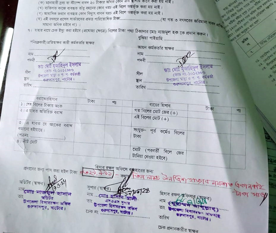 কাজ না করেই গুরুদাসপুর উপজেলা স্বাস্থ্য কমপ্লেক্সের যন্ত্রপাতি মেরামত বাবদ ৩ লাখ ২৯ হাজার টাকা উত্তোলনের চেষ্টা করা হয়েছে। হাসপাতালের পক্ষ থেকে ১৮ মার্চ সকালে হিসাব রক্ষণ অফিসে বিল-ভাউচারটি দাখিল করা হয়েছিল।