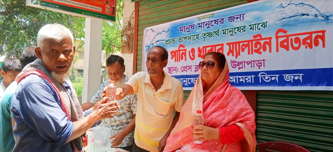 বুধবার সকালে উল্লাপাড়া প্রেস ক্লাব চত্বরে তৃষ্ণার্ত পথচারীদের মাঝে বিশুদ্ধ পানি ও স্যালাইন বিতরন করেন 'মানুষের সেবায় আমরা তিন জন।'