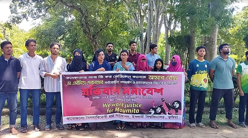 কলকাতার আর.জি.কর মেডিকেল কলেজের ডাক্তার মৌমিতা দেবনাথের বর্বরোচিত গণধর্ষণ ও হত্যাকাণ্ডের বিচারের দাবিতে প্রতিবাদ সমাবেশ করেছে ইসলামী বিশ্ববিদ্যালয়ের শিক্ষার্থীরা।