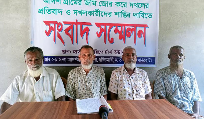 লালমনিরহাটের হাতীবান্ধায় আদর্শ গ্রামে জমি জোর পূর্বক দখলের প্রতিবাদে সংবাদ সম্মেলন করেছেন ভুক্তভোগীরা।