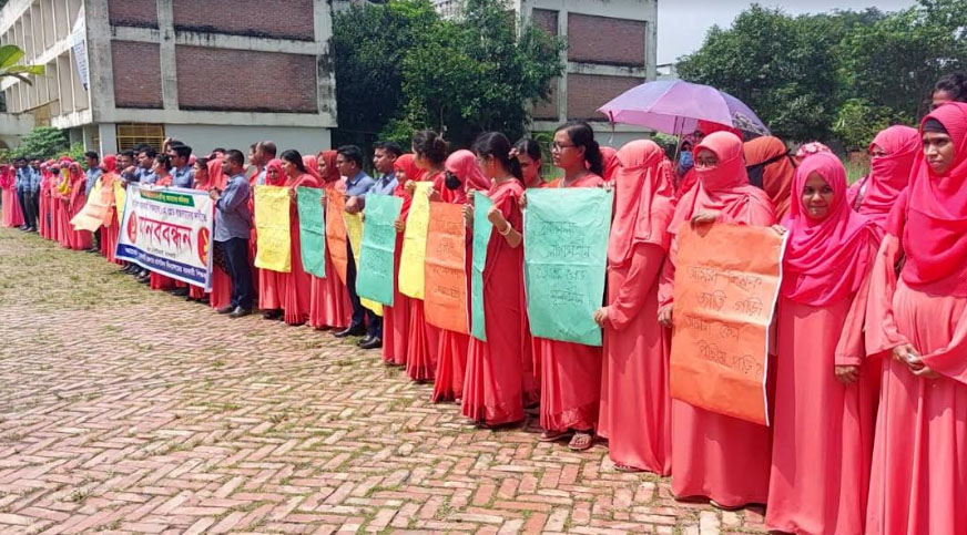 মানববন্ধনে বক্তব্য দেন, ঝালকাঠি পিটিআই এ প্রশিক্ষণরত সহকারি শিক্ষক শিশির দাস, আলী আকবর, সিফাত আহম্মেদ সারা, মরিয়ম খানম, প্রতিক মজুমদার।