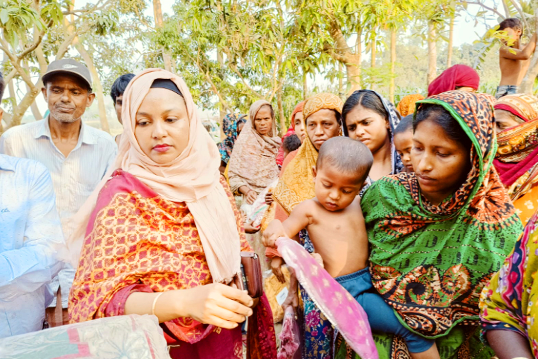 গুরুদাসপুর (নাটোর). আশ্রয়ণের বাসিন্দাদের হাতে নতুন কাপড় তুলে দিচ্ছেন উপজেলা নির্বাহী কর্মকর্তা ফাহমিদা আফরোজ।—ছবি মুক্ত প্রভাত