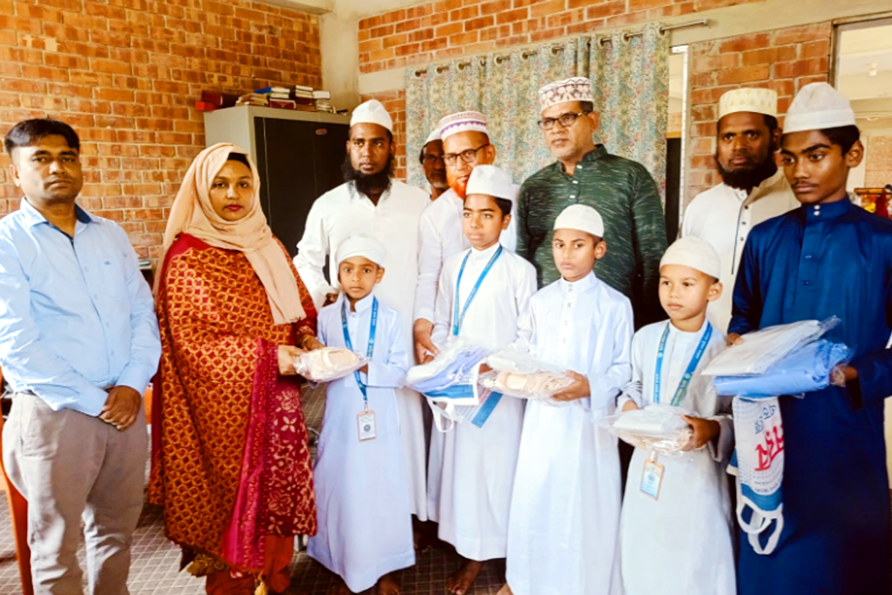 গুরুদাসপুর (নাটোর). মাদরাসার ছাত্রদের হাতে নতুন কাপড় তুলে দিচ্ছেন উপজেলা নির্বাহী কর্মকর্তা ফাহমিদা আফরোজ।—ছবি মুক্ত প্রভাত