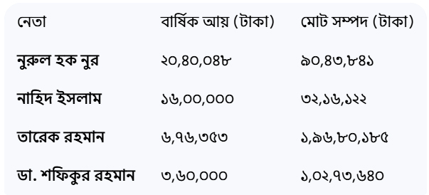গণঅধিকার পরিষদের নুরুল হক নুর এবং এনসিপির নাহিদ ইসলাম আয়ের দৌড়ে এগিয়ে থাকলেও, মোট সম্পদের পরিমাণে এখনো অপ্রতিদ্বন্দ্বী হিসেবে রয়েছেন বিএনপির ভারপ্রাপ্ত চেয়ারম্যান তারেক রহমান।